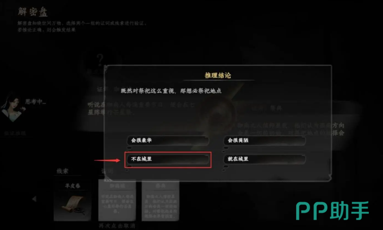 首先来到1929.1826处找蒙格接委托,跟着指引来到蒙腾处获得线索,并完成委托能拿到羊皮卷线索,进行推理将线索二三组合,能得出不在城里的结论,再来到1800.1421处自动触发剧情,拿到新线索,进入推理这次一二组合,得到敲击次数的结论,验证推理。