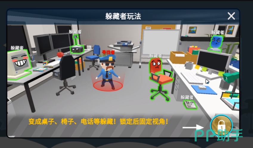 游戏里不只有常规的捉迷藏玩法,在寻找者手中还会持有武器,一旦找到对方成员之后,就可以直接通过枪支抓捕起来,这样抓不完所有的对手,寻找者就可以获得游戏的胜利,躲藏者则是需要静下心来寻找位置躲藏,游戏里采用的是比较独特的物理碰撞体系,加上3d设定能让每个玩家有更真实的代入感,会感觉自己好像真的在和好友进行捉迷藏大战,但游戏会比传统的捉迷藏有更强的趣味性。