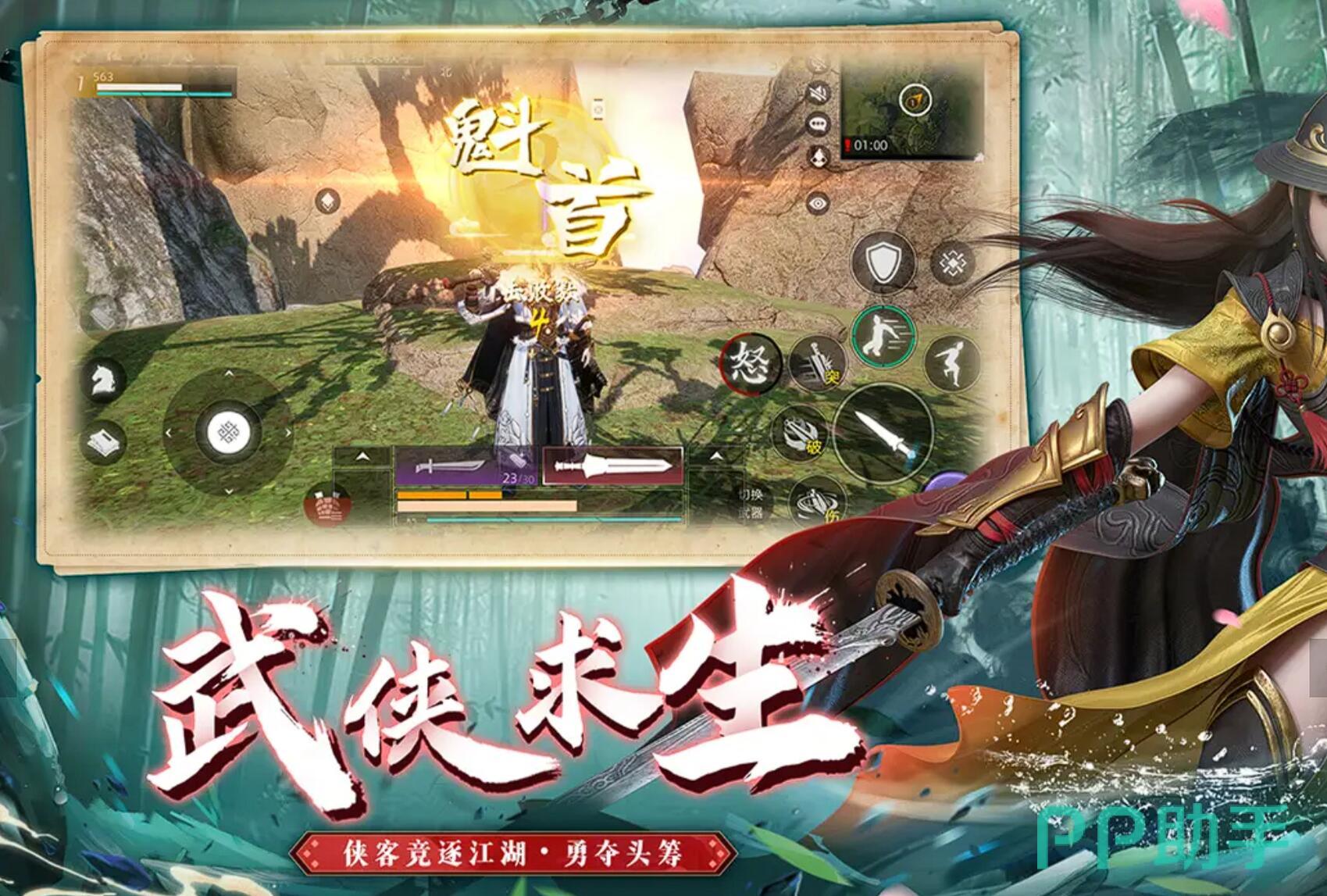 将传统武术与大逃杀玩法结合,打造出冷兵器生存竞技的新体验。百名侠客在明代江湖中争夺武学秘籍与神兵利器,毒雾缩圈的设定迫使玩家在有限空间内展开近身搏斗。长枪、重剑、血滴子等十余种兵器各具特色,连招系统深度还原见招拆招的武侠对决。心法爆气、陷阱布置等机制让战斗充满变数,而滑翔伞与马匹的加入则丰富了地形战术。