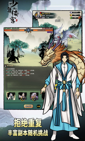 该款水墨画风的游戏简直太细腻了,营造出了更加热血激情的江湖世界,好像真正的感受到了独特的江湖体验,你可以独自一人去闯荡江湖,感受到真正的自由,也可以拜师学艺。通过不懈的努力之后才能够学到更多的绝世武功,无论是在江湖行走还是要寻找对手一起去进行对战,自由性真是很高,《少年侠客》还支持着挂机的方法。