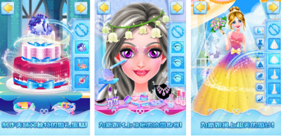 专门为更多儿童进行设计,以特别唯美的童话风格进行展现,都是围绕着冰雪王国公主以及王子世纪婚礼的整个过程进行讲述,您在其中需要发挥出自己的想法。做好婚礼的策划,还需要为其中的人物角色进行装扮。这里的化妆品类型特别丰富,每种化妆品都可以让玩家随意使用,可以为其中的公主进行妆容的设计。通过玩家的一手打造,将提升了公主的整体气质。