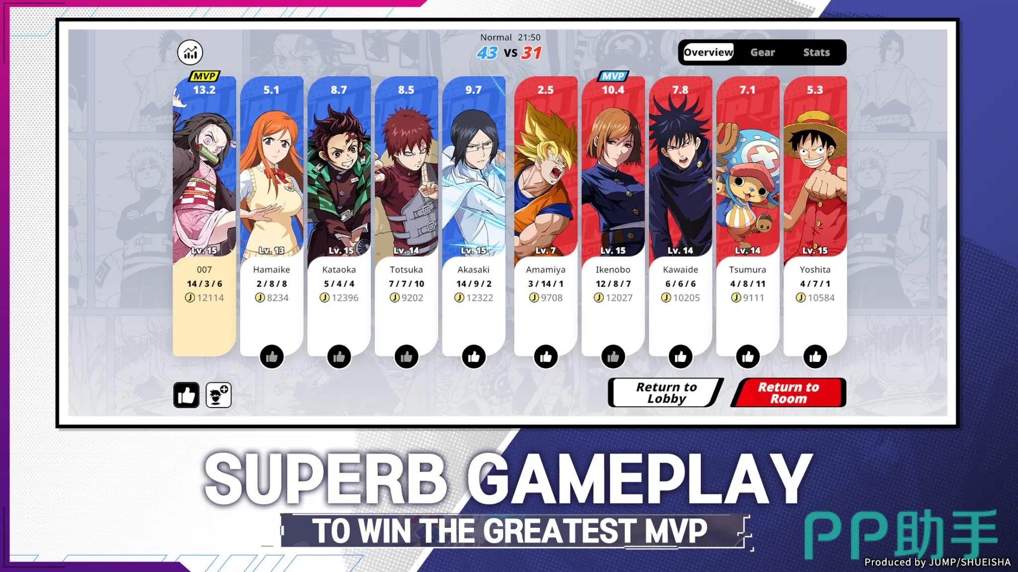 漫画群星大集结是一款根据多款经典漫画改编而成的moba类型游戏,玩家在游戏里面可以看到很多经典的漫画形象都会出现,比如说火影忍者中的鸣人、我爱罗,鬼灭之刃中的炭志郎、弥豆子等等,玩家可以选择一个自己最喜欢的漫画角色去和对手战斗。