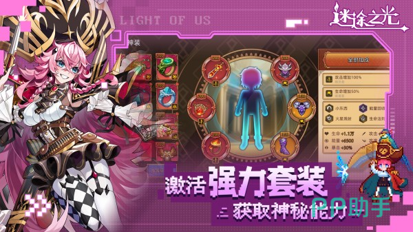 此游戏通过精彩的像素画风展示,核心玩法以弹幕射击为主,融合了奇妙肉鸽元素,令各位冒险家面对的挑战关卡充满了新意。《迷途之光》中提供了多达几百种各色技能,小伙伴可以尽情发挥创意搭配组合,以应对丰富挑战。不同人物角色也支持各位进行养成提升。别具一格的像素奇特画风,也是游戏出色的画面特征,令大家眼前一亮。