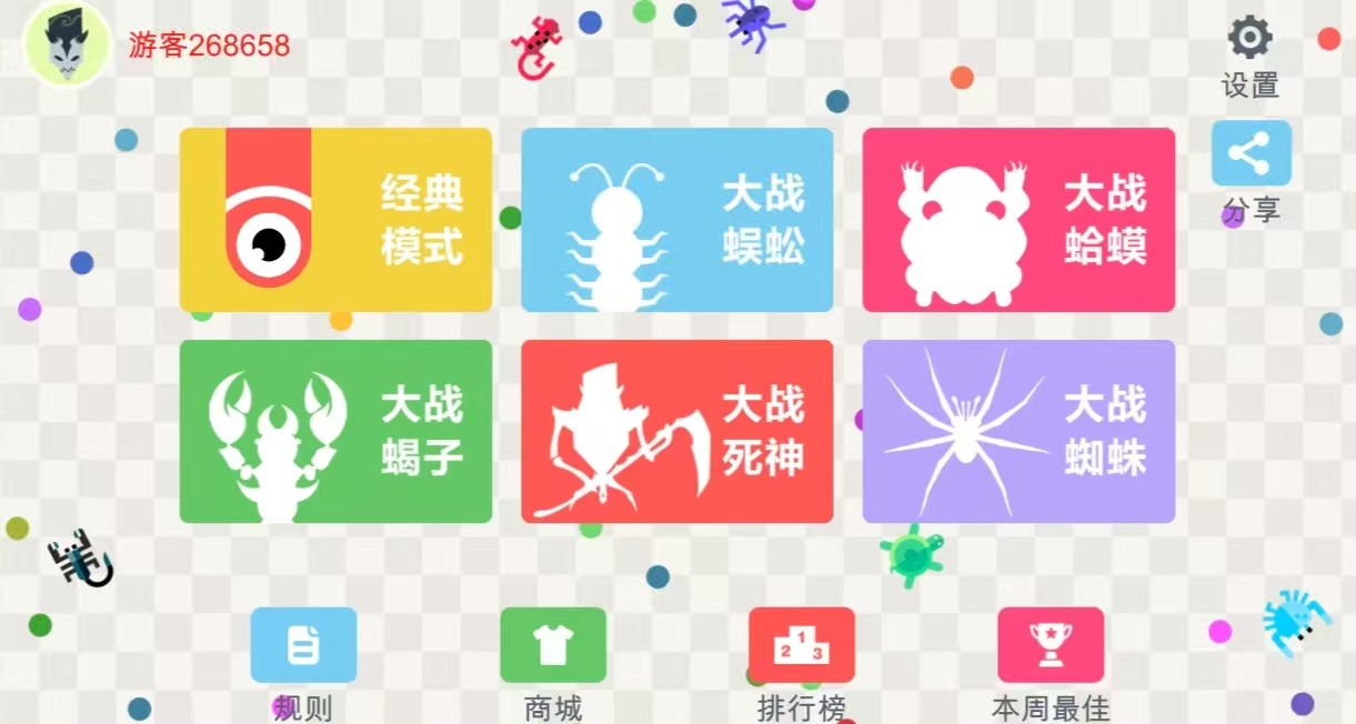 《五毒大作战》设计了一个清新卡通的画面。游戏内的主角是许多的毒虫,提供了非常多不同风格的皮肤,分别赋予了不同的天赋和能力。可以在地图上到处进行游走,在过程中可以不断的吃食物,角色会慢慢的逐渐变大,还会遇到很多其他的游戏玩家。在游戏的右上方可以看到玩家的排名,可以逐渐的提高自己的分数,还可以拉上网友进行合作,比一比谁能生存到最后。