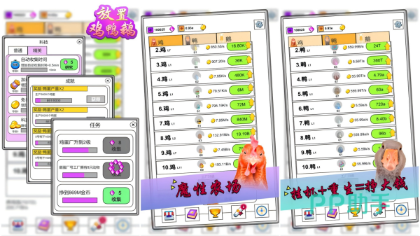 最后带来一款趣味养殖模拟经营小游戏《放置鸡鸭鹅》。在此各位玩家会变身养殖场的管理人员,进行鸡鸭鹅的养殖,不断令这些家禽下蛋,进行出售以及孵化,逐渐升级养殖场,购买设备提升技术,发扬光大养殖场。游戏娱乐玩法略显鬼畜,却充满乐趣。大家可以沉浸其中,快乐模拟养殖,成为一方家禽养殖大户。