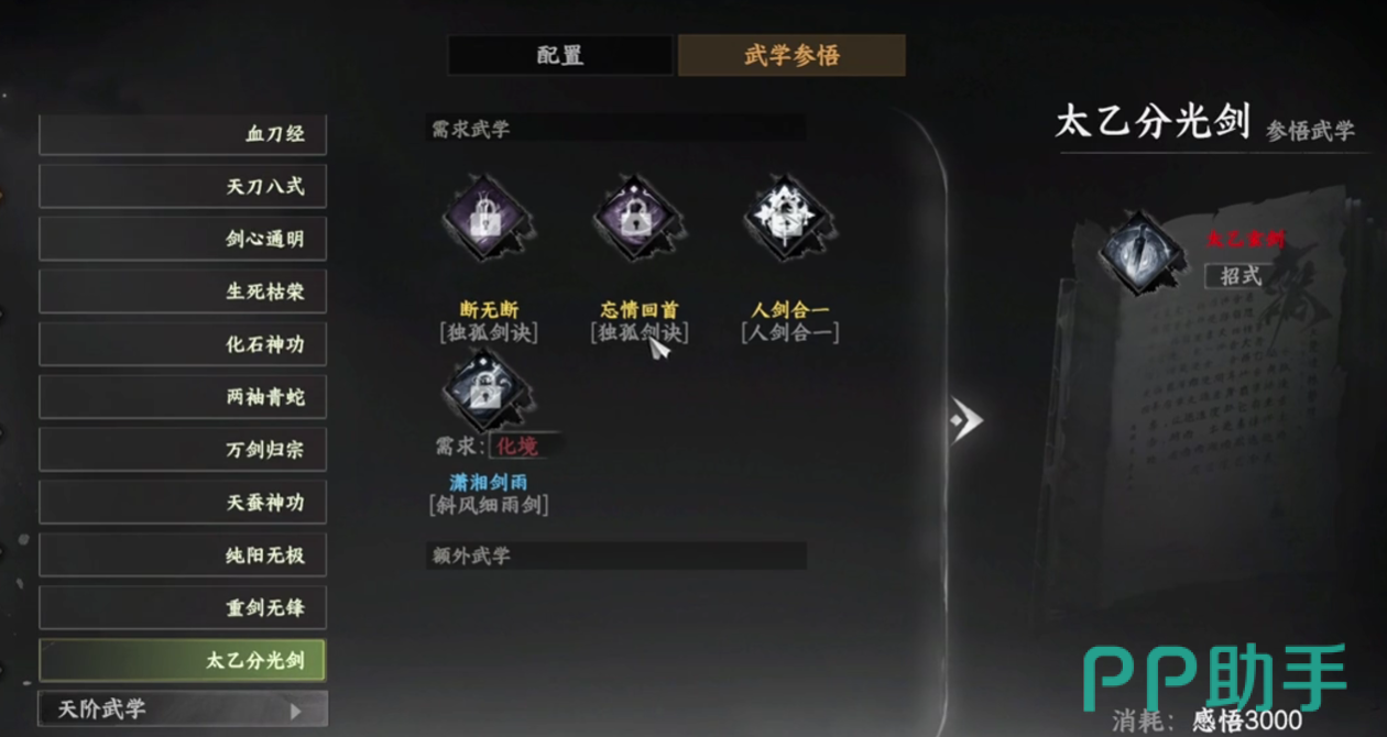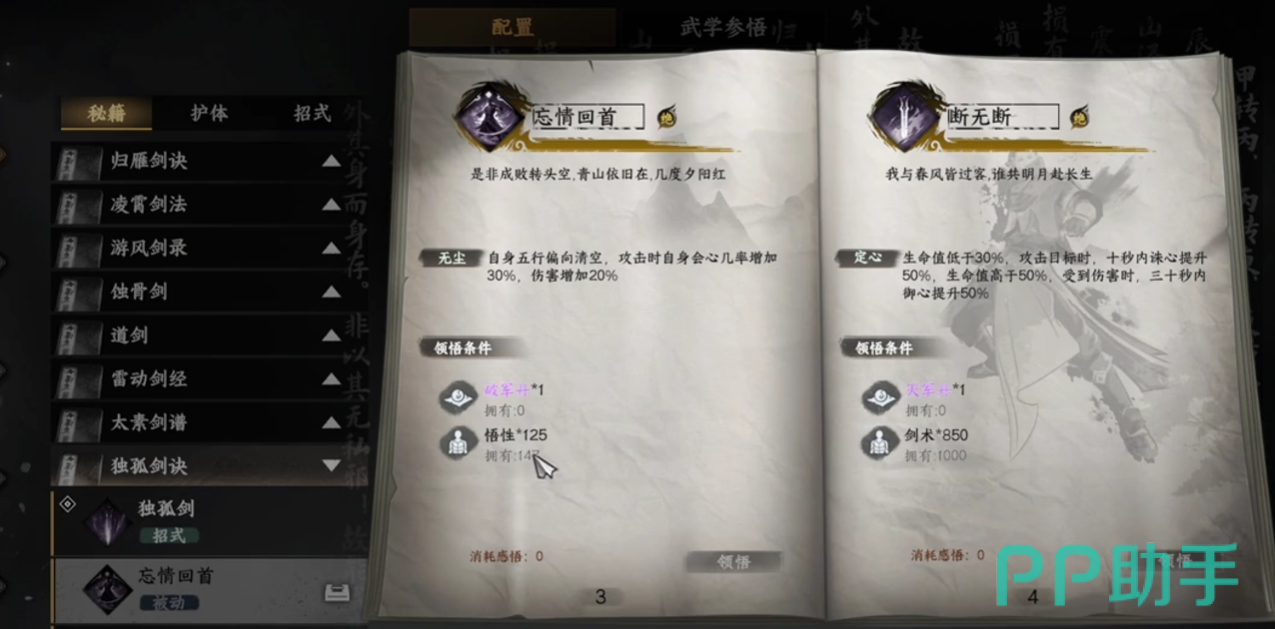 刚开始玩家可以在武学的秘籍中找到独孤剑诀,将独孤剑决点开后会发现有两个被动技能,一个是忘情回首,一个是断无断,此时玩家会发现有领悟的选项,但是领悟选之前有领悟条件,玩家们最好将领悟条件集齐之后就可以将忘情回首和断无断同时领悟,这样就可以同时解锁两个剑诀,其中忘情回首需要破军丹,断无断需要灭军丹,在游戏中玩家们可以找到一些游商购买两个丹药的配方,最好再将炼制丹药的药材也全部集齐之后炼制丹药,并且领悟条件还有忘情回首需要悟性125,断无断则需要剑术850,将领悟条件全部达成后,就能够将两个剑诀解锁了。