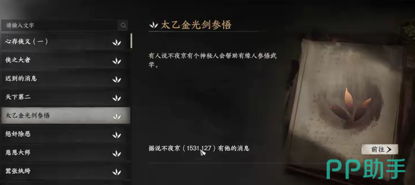 首先太乙金光剑参悟是属于江湖奇遇中的其中一个任务,这个任务是可以随机触发的,不过小伙伴们可以直接到江湖奇遇中查找到太乙金光剑参悟会有具体位置,具体位置在不夜京(1531,127),在齐国的(1530,127)这个地方玩家们可以遇到一个神秘高手,当和神秘高手对话之后就可以触发太乙金分光剑的任务,这个时候玩家们可以在武学中找到武学参悟,接着在地阶武学中找到太乙分光剑,此时发现太乙分光剑中有4个剑诀需要玩家完成。将4个剑诀全部拥有之后,玩家们会直接解锁新的招式-太乙分光剑,其中断无断和忘情回首都属于都属于独孤剑诀,还需要的就是人剑合一和潇湘剑雨,潇湘剑雨属于斜风细雨剑,并且需要玩家们达到化境期,只有将这4个剑诀全部解锁才会拥有太乙分光剑。