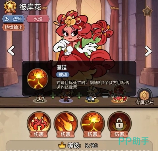 彼岸花是一名持续输出型法师,她的技能可对敌方单个目标施加灼烧状态,该状态下敌方每0.3秒都会受到基于彼岸花5%攻击的伤害,配合上被动焚心,可叠加至四层。当彼岸花到达5级后,还能解锁第二个被动蔓延,只要处于灼烧状态下的敌人死亡,它身上的灼烧效果会立刻传导给旁边的两名敌人,且该被动没有冷却,只要敌人状态符合条件,就能无限制地进行灼烧传导。在彼岸花20级时,后一个被动灾异之火也会随之解锁,该被动能对灼烧目标造成3%生命上限的额外伤害。