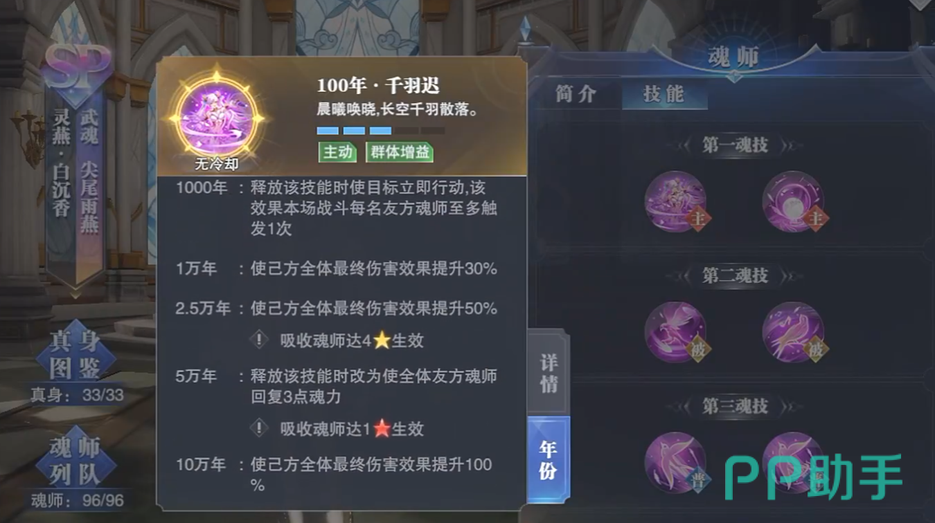 4星解锁120万年,效果变为提升200%所有队友永久最终伤害,达到5星解锁200往年,释放该魂技会额外给所有队友施加上“燕影”,并使得队友受到的魂技伤害降低50%,持续1回合。