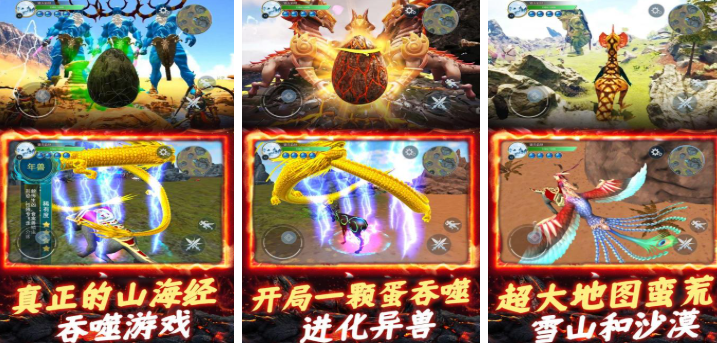 在山海吞噬进化游戏中,以古典典籍山海经为核心背景,构建了一个充满奇幻异兽的开放世界,玩家初始将操控一种基础山海生物,通过吞噬场景中的灵气结晶、草药,或是其他小型异兽获取进化能量,游戏的核心亮点在于山海经式进化树,每一次进化都能解锁贴合典籍记载的异兽形态。
