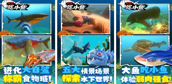 大鱼吃小鱼游戏中,作为经典吞噬题材手游,以层级吞噬与快速成长为核心玩法,构建了从浅海到深海的多层级海域世界,玩家初始操控一条小型淡水鱼,通过吞噬体型更小的鱼类、浮游生物获取成长值,成长值满后体型增大,可吞噬更大体型的鱼类,逐步向更广阔的海域探索。