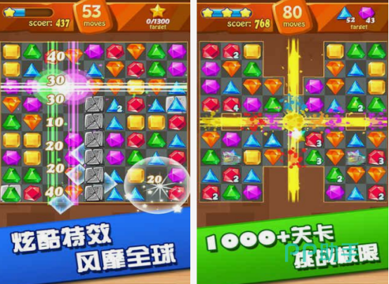 这里不仅有超多的关卡,还有炫酷的各种颜色宝石,匹配三个或以上的,就能完成任务。还会在玩的过程当中生成各种各样的道具,通过正确的使用以后,无论是横向或者是纵向,都能帮助玩家,同时消除的数量更多,顺利通过。所具备的特点就是,随着关卡不断提升,难度也会增加,只有仔细地根据关卡的设置来开启,完成目标才可以。