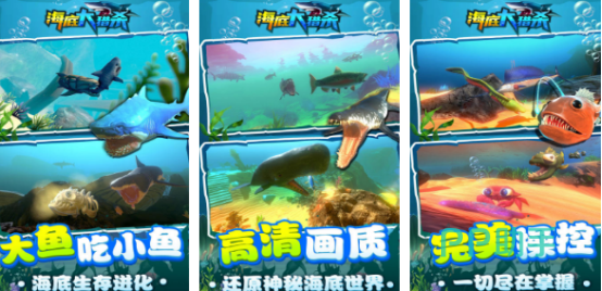 画面制作精美,将背景设定在充满众多资源的海底世界中扮演一条鱼,在海洋遨游,最初可以捕食蚯蚓或者小龙虾等比较小的海洋生活,随着时间推移将获得更多的能量不断强大,自己成为超大的鱼类,将鱼群一口吞入肚子中。有较为分布的地图共分为三大区域,包含海洋沼泽,不同环境中的鱼类资源是有所差异的。