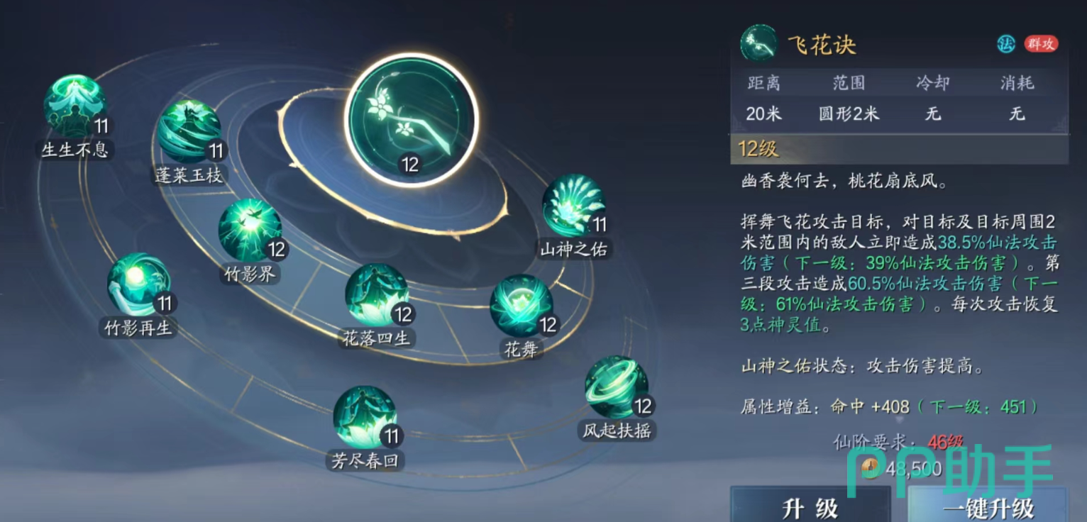 他的“花舞”会对周围3米内的敌人造成仙法伤害以及击飞,在强化中会被替换成“风起扶摇”向着前方释放出龙卷风,对路上解除到的敌人们造成伤害击飞,他的花落会给选定的队友恢复气血,并让范围内气血最低的队友也获得回复。