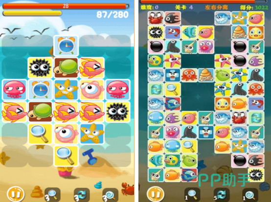 以海底各种可爱的小动物,可进行消除的连连看手游,涵盖了280个关卡,每个内容都是不一样的。想要顺利的挑战成功,也要合理地使用游戏当中的道具,比如在使用放大镜的时候,可以给大家进行提示消除一对小动物,但是想要增加时间的话,就需要使用棒棒糖这样的道具,你要掌握每一个道具的正确使用时间以及方法。