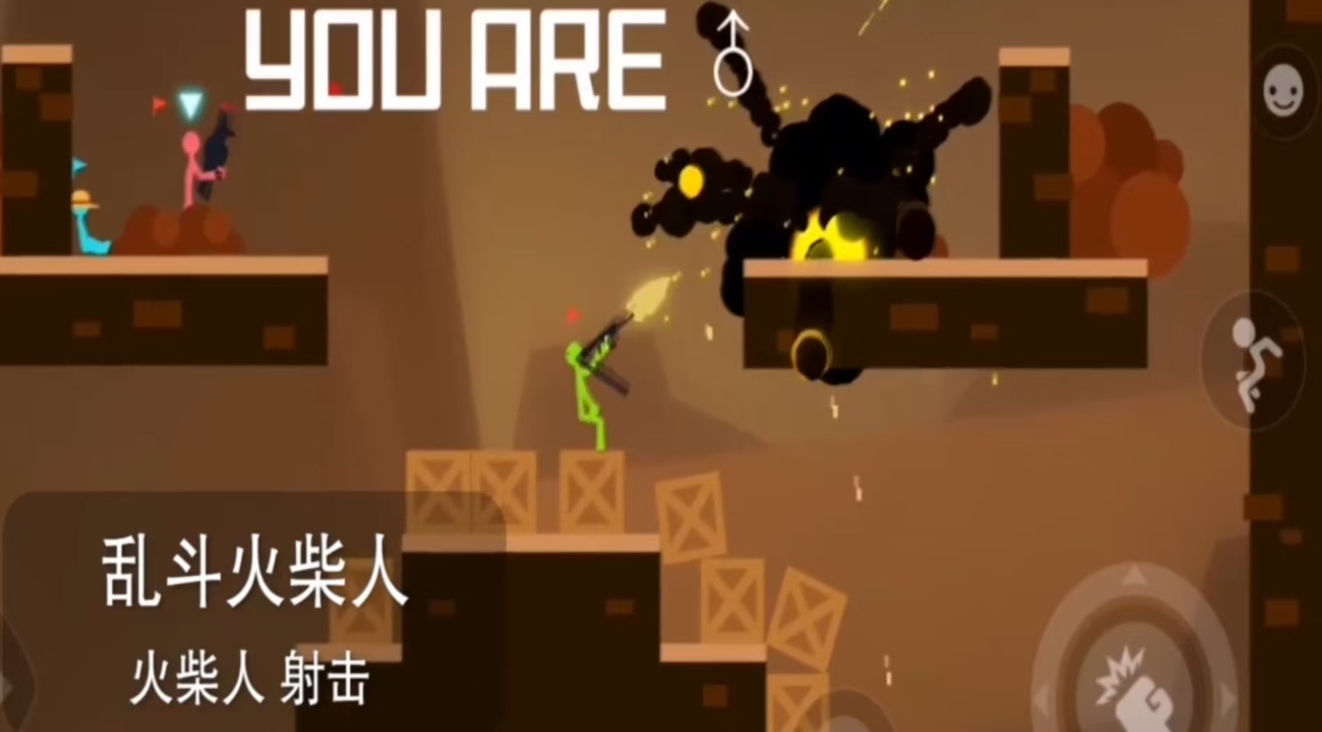 超级动态的火柴人对战游戏,在这里游戏场景是不断变换的,地形一直动态切换,武器和道具四处乱飞,随手抓起掉落在旁边的武器道具就开始打斗,全看运气。支持2-4人PK,超愉快又随机的战斗体验,充满乐趣,同时有各种魔性特效和音效,整体画面混乱但滑稽。用简单的色块线条搭配明暗制造层次感,简单画面打造出魔性的战斗场面,让人上瘾。