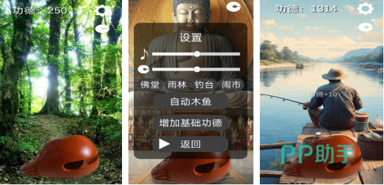 呈现出了四大经典的场景,比如有钓鱼台以及佛堂等等,您可以在这些场景当中,随意切换每个场景中所富含的背景音乐,以及所呈现出来的内心想法是完全不同的。当自己心烦意乱的时候,就可以点开此游戏,虔诚的进行木鱼敲击。其中设置了对应的玩法,比如自动功能以及手动功能等等,将会给玩家带来极强解压感。