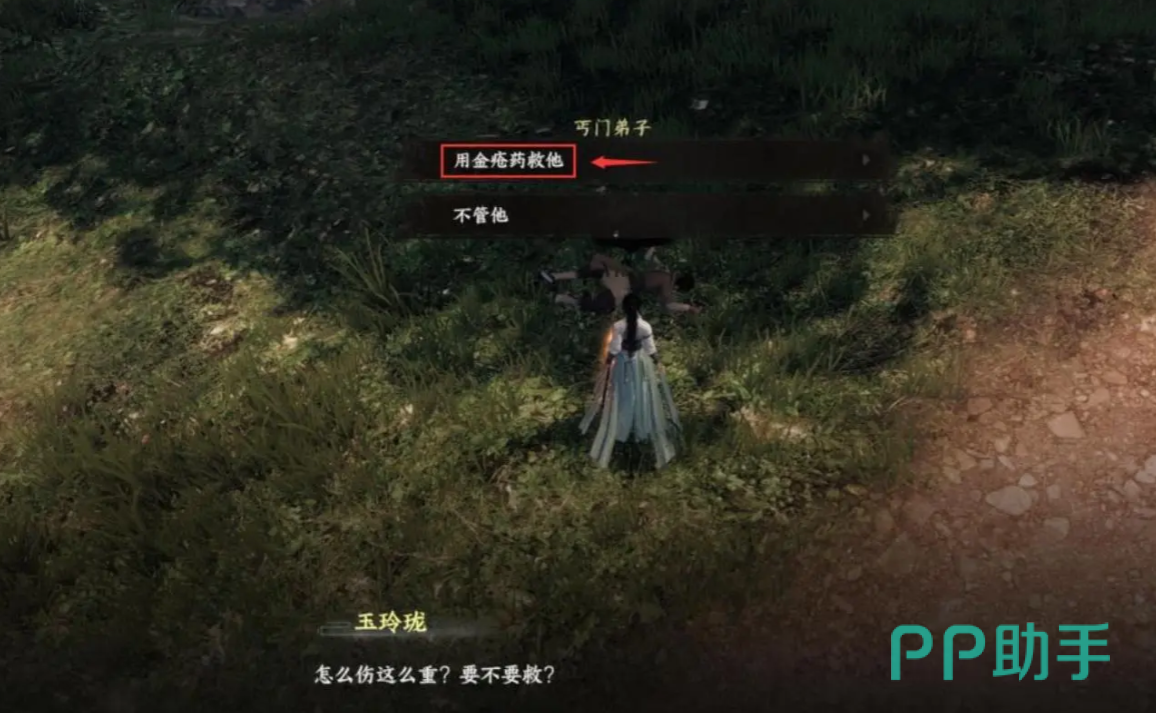 首先我们到不夜京坐标为971.428的地方,在这里自动就会遇到丐门弟子,此时他深受重伤,我们路过必须要选择第一个选项,获取金疮药救助,这样能获取后续线索,如果选择选项2放任不管,会导致这个任务没有后续。
