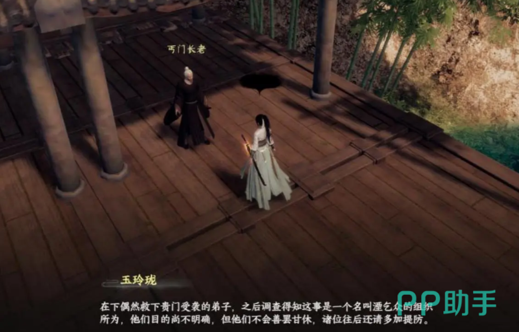拿到线索后前往丐门,到了大门口会自动触发和守门弟子的对话,交谈完毕就可以进入丐门,这里直奔坐标539.389处,找到丐门长老交谈,和他说明我们救下门派弟子的事情,以及神秘人有目的后,获得另外一条线索。