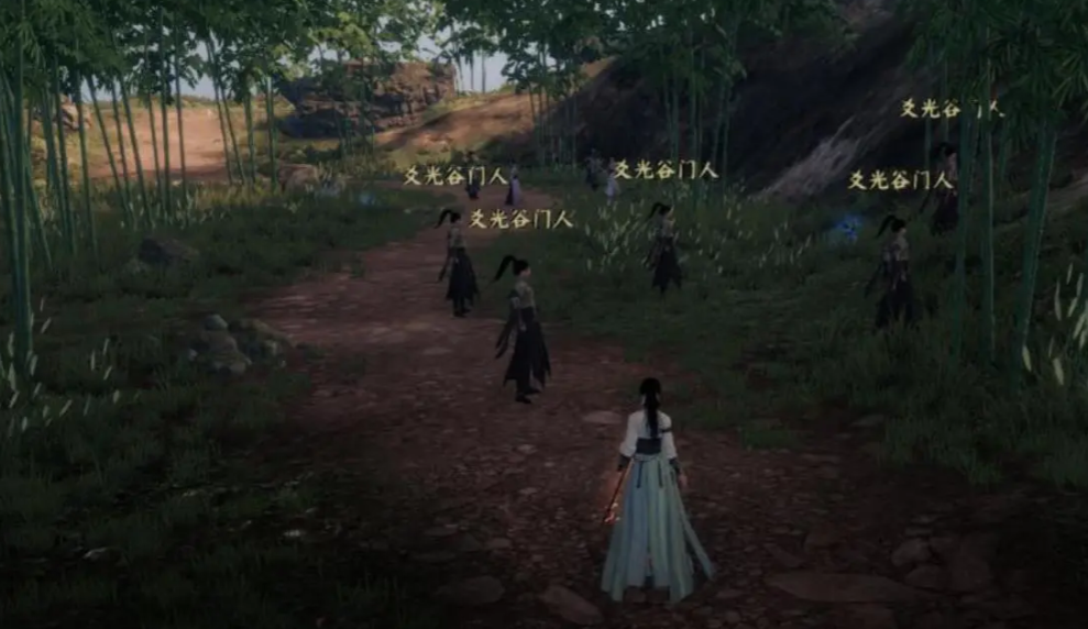 来到爻光谷坐标377.956的地方,在这里会自动触发3个门人拦路的剧情,此时出现抉择,大家记得两个选项都去选2,然后将这3个门人给击败,沿着这条路线一边走,一边击败敌人,在看到三叉路口的时候左转会触发剧情。