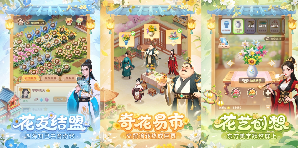 拥有精致画风,背景建立在古代,玩家需要经营自己的花园,可以结识各种花友,并与彼此分享自己的作物,种植鲜花的过程中还可以不断培育新品种,并凭借奇异的新品花朵进行贸易流转,同时还有花艺玩法能让你自由组合不同花朵形成绚丽景观,你也可自由购买各种装饰来装扮自己的花坊,从多个方位尽情体验模拟经营的乐趣。