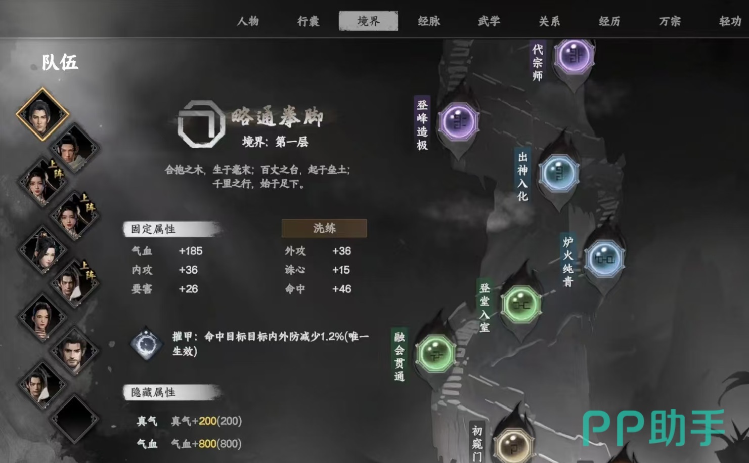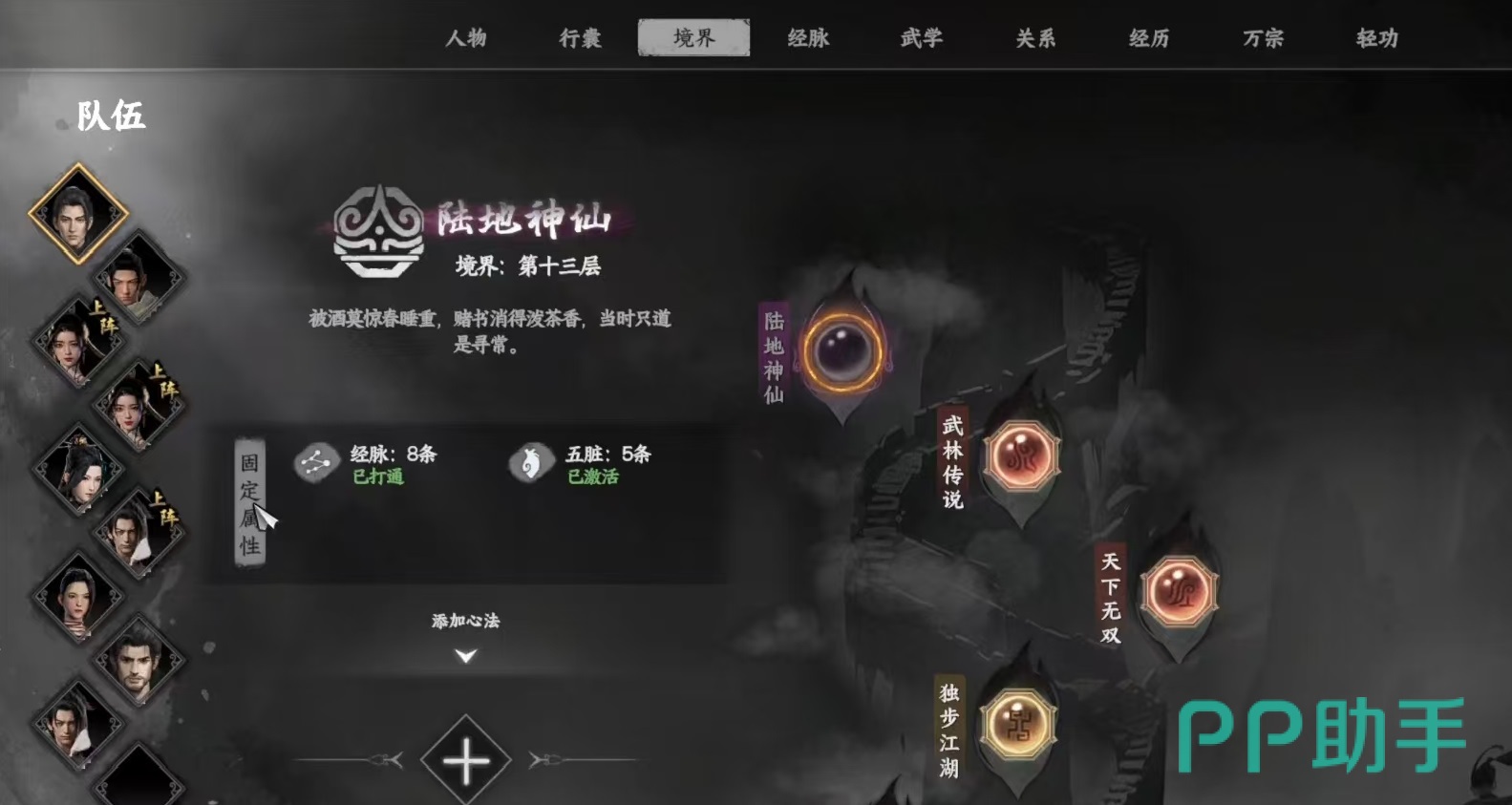 玩家进入到江湖之后,境界是证明武学成就的重要方式,也是自身的重要提升。境界是从初窥门径开始,到后来的融会贯通,最后登临陆地神仙境。境界突破有一定的要求,大家可以在添加心法的上方看到往后解锁所需要的各种条件,在达成条件之后,消耗修为就可以进行突破,提升境界之后可获得额外属性。修炼后可进行进阶,进阶解锁隐藏属性,进阶条件也是在左下方查看到。境界可添加心法洗炼,并随机获得心法中的一条属性。不同境界需要不同品级的心法,境界越高,可添加的心法品质也就越高。