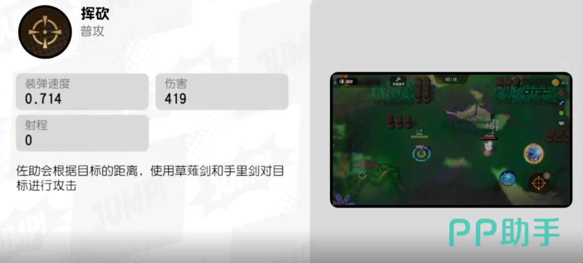 佐助的普攻比较特殊有两种攻击手段,会根据敌方与自身之间的距离,来使用草薙剑或者手里剑对目标进行攻击,近身会使用草薙剑,这个武器挥砍有一定范围并且还伴随击退,远程用手里剑,能打出较远且精准的攻击。