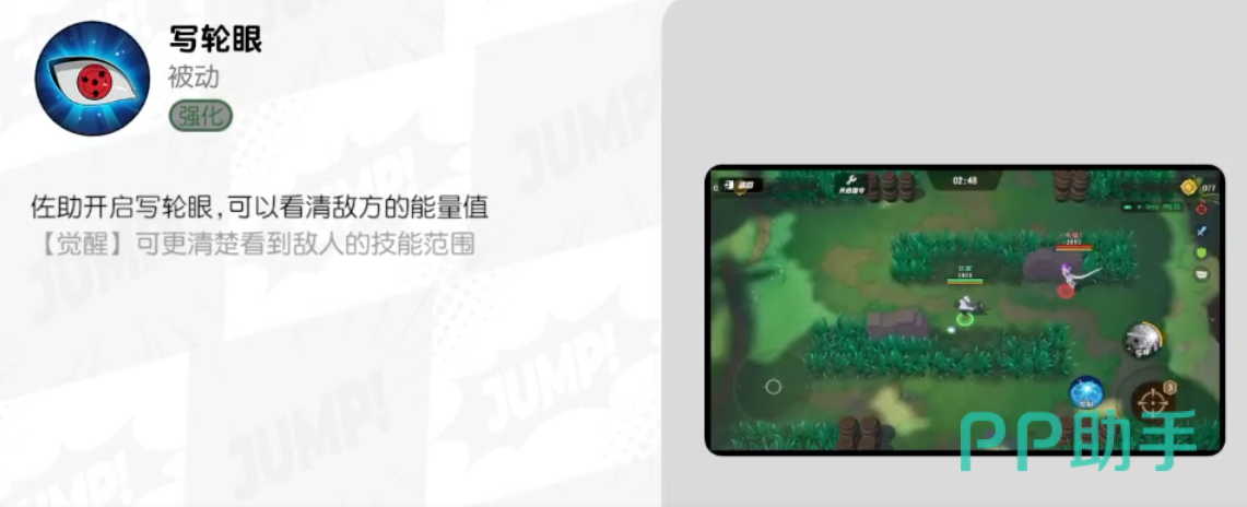 他的大招“千鸟”会快速向着敌方进行突进,并带来一段伤害,觉醒后可以增加突进的距离,天赋能帮助在突进的时候,若沿着墙体则可以滑行一段距离,他的被动会开启自己的写轮眼,此时将能直接看到对方的能量值,觉醒后可以更清楚看到敌人的技能范围。