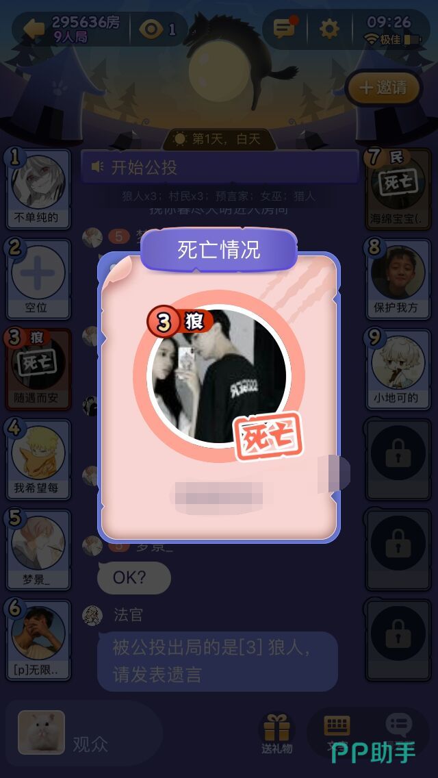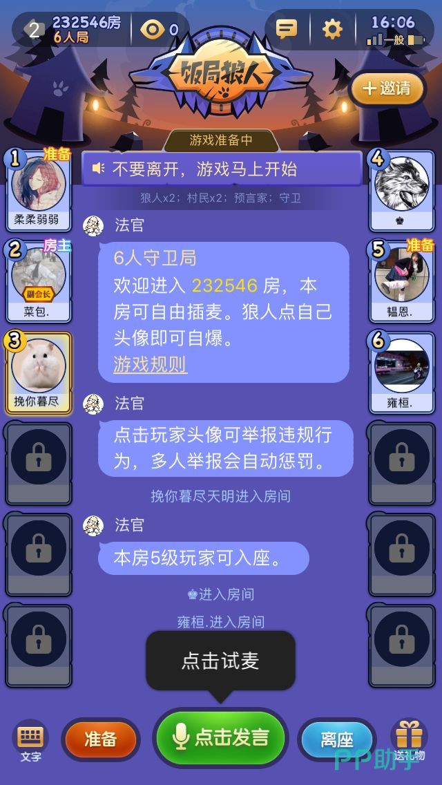 游戏配置:3个狼人、3个村民、1个预言家、1个女巫、1个猎人。