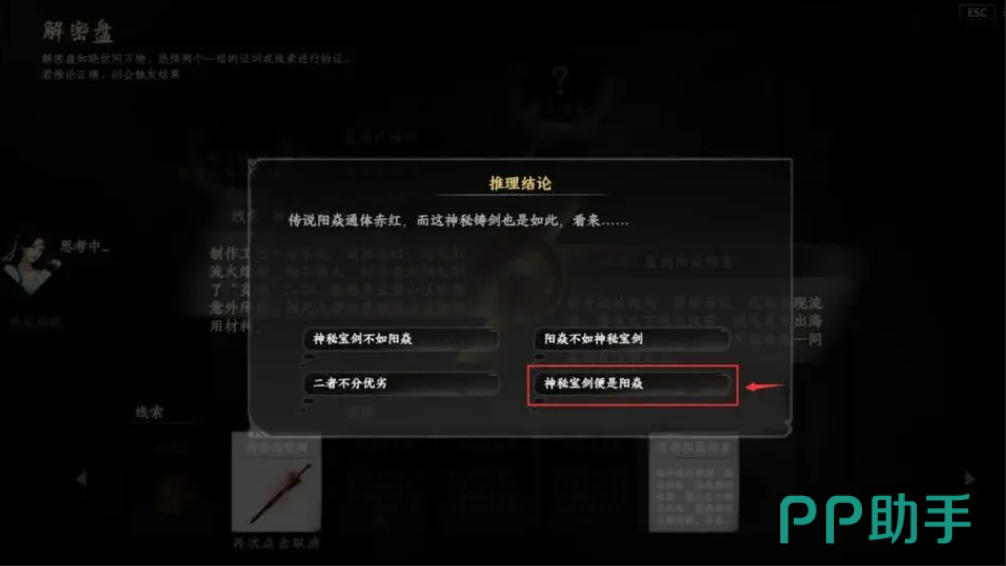 但到这时,手头掌握的线索还远远不够,系统给出提示,前往坐标为(796,436)的铁匠铺去打听打听。刚一走近,就自动触发了剧情,从剧情里又获得了新的线索。再进行二六组合推理,结论选最后一个。要是验证推理灰色,重新调整正确推论就行,验证成功后会收到铁匠铺邮件,解密完成,再对话铁匠铺老板,还能获得阳焱。