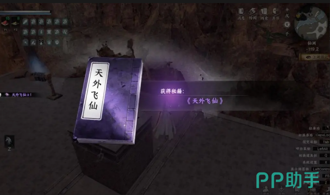 先别急着去地宫,要先收集道具。来到(-68.-50)开启宝箱获得仙洲地宫钥匙,接着向前(-124.-63)击败燕行舟获得石质剑牌一,再前方树下(-75.14)击败太监获得石质剑牌二。道具收集齐后,就可以去地宫探索了。玩家来到赑屃像的地方可以触发(-125.33)交互开启,最里层交互左、右石像,宝箱就会出现,开启宝箱就能获得剑法秘籍天外飞仙。