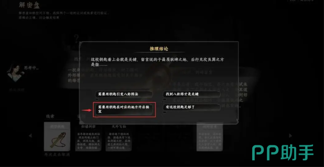 收到白宗冀邮件后,来到仙洲(-163.120)走近白宗冀,自动触发对话获得仙洲的线索。再直接对话旁边的东方御。来到大鼎触发线索,进行组合推理,选瞻皓仙为正解。接着大剑旁(-167.38)自动触发,获得剑形钥匙线索,再进行一六组合推理,结论选下面第一个,剩下的不用组合,验证解密完成。