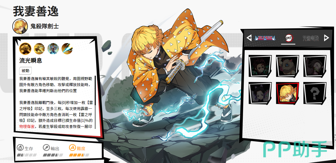 我妻善逸作为《漫画群星大集结》中操作与收益并重的刺客,适合追求极限爆发的玩家。其技能机制高度还原原作设定,虽需精准的节奏把控,但熟练后能成为团队的核心收割者。