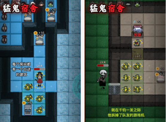 游戏中的玩家不仅可扮演猛鬼,同时也能担任6名躺平者,属于有着轻度恐怖风格的塔防对抗类型小游戏。面对游戏中的宿舍环境以后,为了避免猛鬼的追捕,躺平者通过在房间里面完成建造,可以更好地抵御猛鬼的脚步。如果猛鬼可以将所有的躺平者捉到的情况下,就可以成为最终的获胜方,所以躺平者的话,一定要避免被抓到。