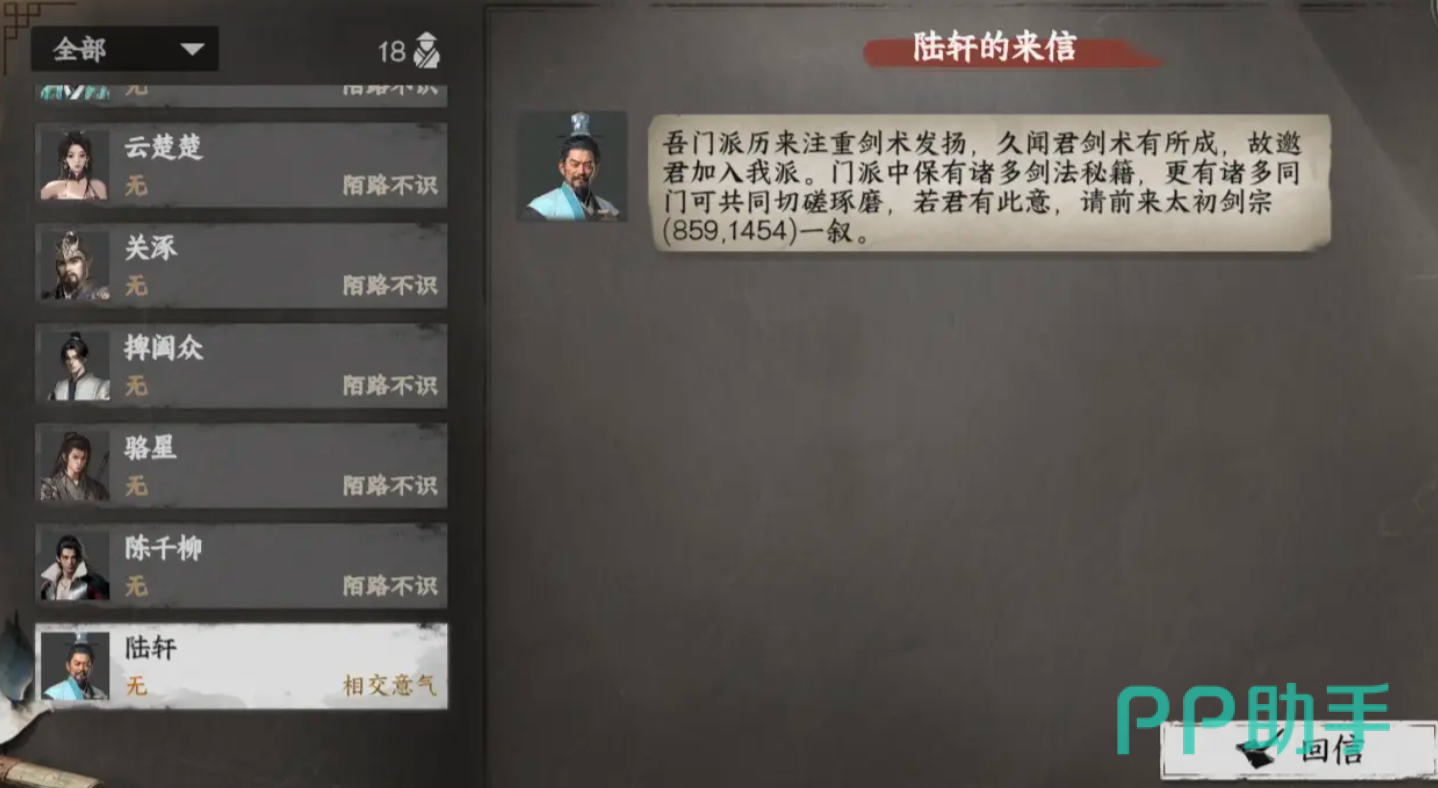 在剑术大于50时我们就能收到来自陆轩的飞鸽,跟着内容来到太初剑宗859.1454处,和陆轩进行对话,选择入门派师之后再进行一次重新对话,本次对话会让我们接取到处理剿匪的支线,该支线点击追踪会有指引,我们跟着指引完成就能触发剧情顺利加入门派。