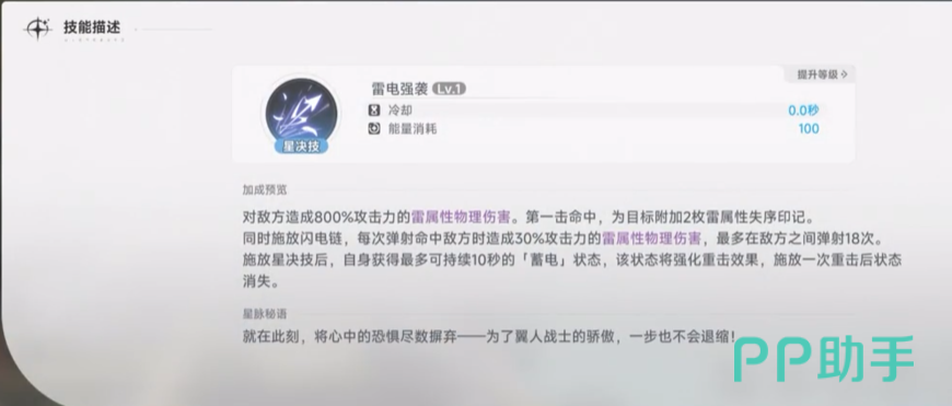 星决技为雷电强袭,这是一个能够给敌人造成800%攻击力的雷电物理伤害,第一击命中地方以后,可以附加上2枚雷属性的失序印记,同时还能向敌人使用闪电链,每一次命中对手都将造成30%的雷属性物理伤害,最多能够连续射出18次。