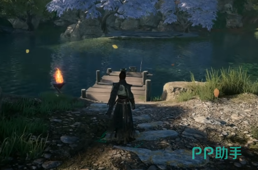 河道尽头将遇到一处瀑布景观,玩家需在此处运用轻功系统,先通过跳跃登上瀑布顶部的平台,调整视角观察瀑布中段位置,此处岩壁上会显现一处隐蔽的石门,石门周围因特殊环境因素生长着发光莲花,成为明显的视觉标识,玩家需施展轻功从瀑布顶部向中段石门方向跳跃,注意把控轻功的力度与方向,避免因跳跃距离不足或过度而错过石门区域,成功抵达石门位置后,交互石门即可进入地宫内部。