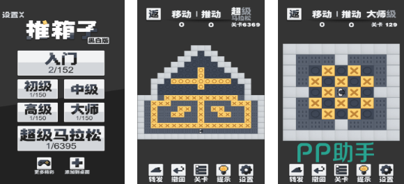 这款黑白版本的推箱子神作也拥有不大的内存占比,玩家可自由选择不同难度的关卡展开推箱子互动,游戏任务多样且箱子数量也是随机的,在有限的地图上把箱子推回原位即可获得胜利,马拉松和大师级的关卡让这款游戏的玩法更多,温馨的提示功能也会让小白感受到推箱子系列游戏的魅力哟。