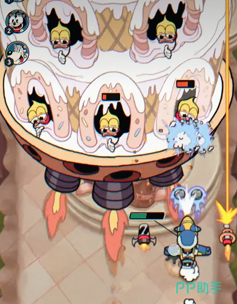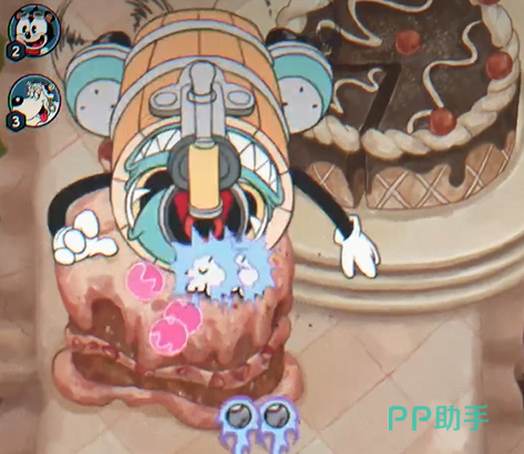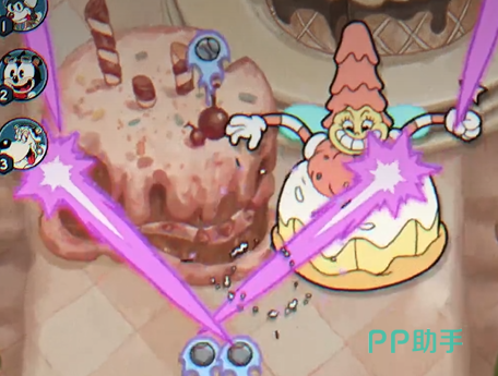 紧随其后的布丁教母,攻击方式简单但也不容小觑。她会不断撒糖果弹幕,并且有时还会悬浮糖果在屏幕中间。虽然攻击模式看似简单,但你依旧得保持高度警惕,避免糖果击中自己,慢慢清理她的攻击模式就好。