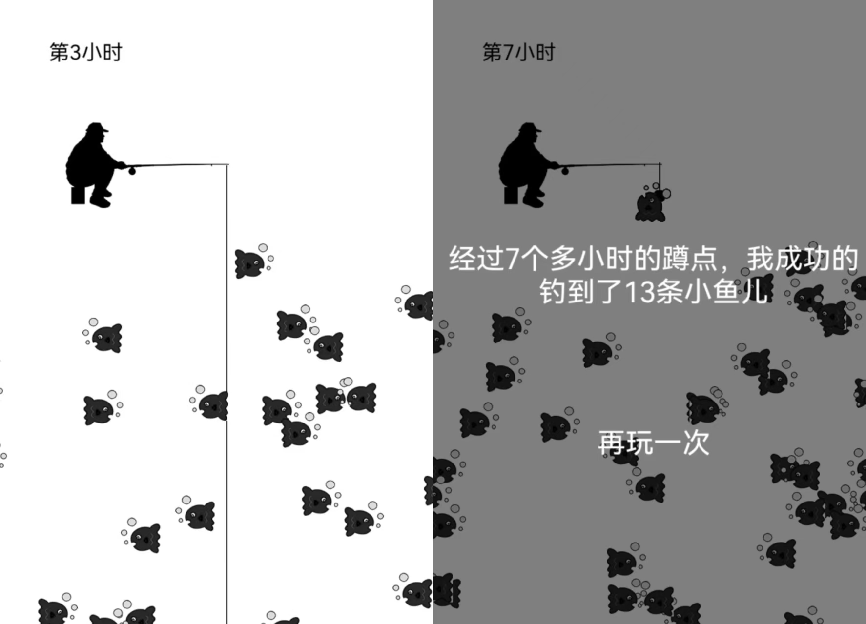 画风简约的模拟钓鱼作品,老爸坐在江边等鱼满满游出来,极致考验玩家的耐心,等待时间越长,鱼的数量就越多。看准位置和时间点抛出鱼竿,迅速捕捉鱼群,尽可能钓到更多的鱼。简约黑白画面,没有复杂的操作和难度的规则,旨在给玩家提供最正宗朴实的钓鱼体验。超长等待时间,以小时为时间单位,是耐心的极致考验。