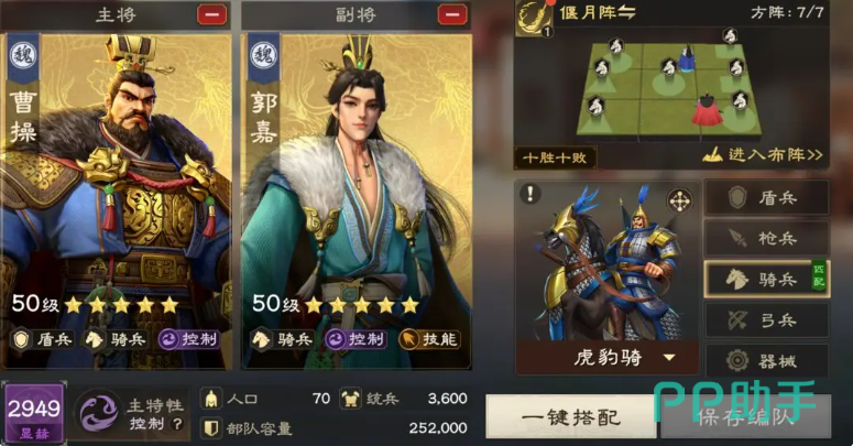 控制骑体系精髓在于通过多层控制链削弱敌方战斗力,以割须弃袍羁绊为核心的割须骑组合,由曹操与马超这对经典搭档坐镇,利用虎豹骑延长控制时间的兵种特性,配合偃月阵或方圆阵的空间布局,构建起密不透风的控制,马超携带的沉默与降怒技能,直切敌方技能输出,曹操施展的缴械与状态附加可以控制,当两位将领的控制技能无缝衔接时,便能形成压制链,此套阵容尤其适合应对依赖主动技能的队伍,在蛮族挑战等持久战中,更能凸显其降低战损的优势。