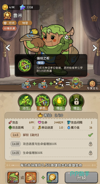 鲁米是强大的坦克英雄,他有着独特的分摊伤害机制,能帮助更好的保护后面输出高但自保能力弱的后排,多阵容都适用,他的终结技会直接回复链接者30%的生命值,他的“缠绕之根”会在开局时,直接跟后方的神话英雄进行链接,帮助他承受50%遭受的伤害,他的融光会获取链接队友30%的攻击力,同时也会让该队友拿到自己30%生命值,来进一步加强对关键队友的协助和保护,他的抚慰会和链接队友共享普攻带来的魔力回复。