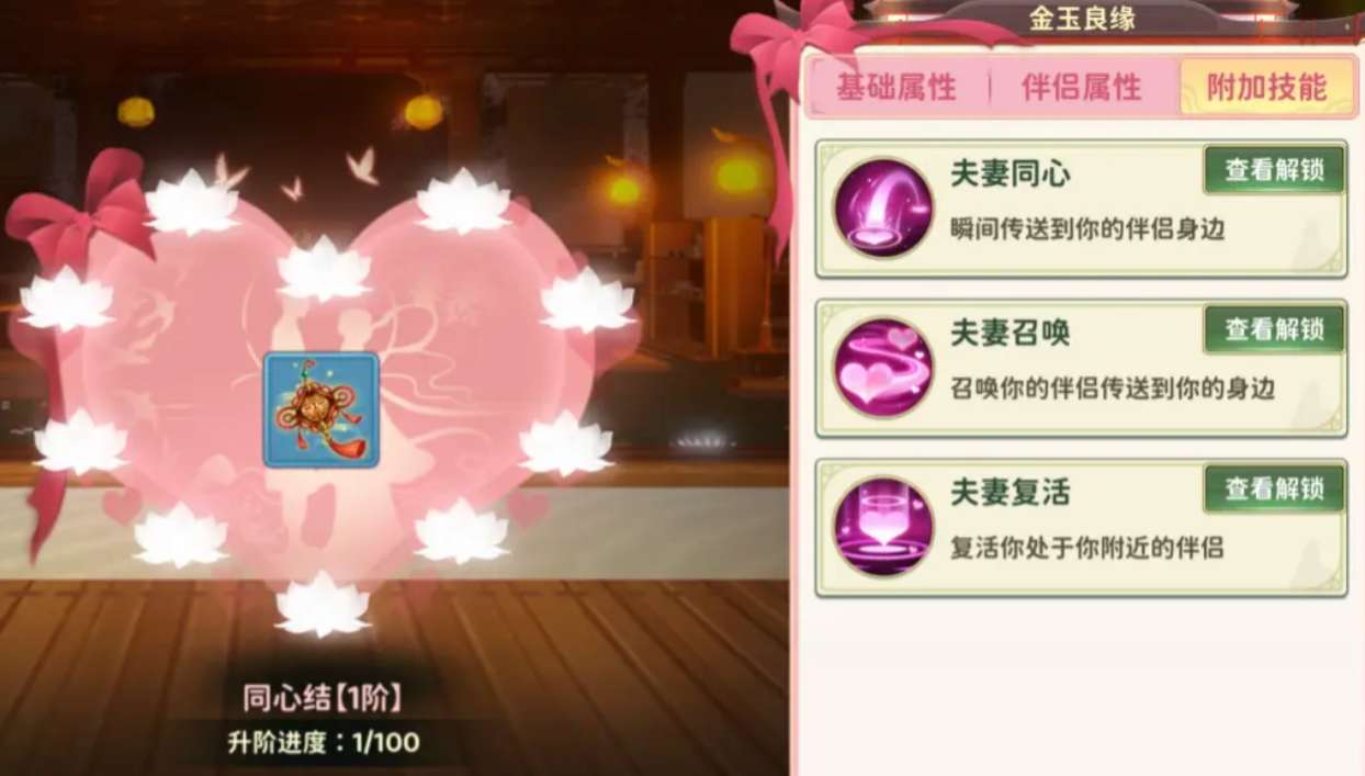 顺利结婚后双方将获取特殊的同心结,同心结将包含基础属性、伴侣属性以及技能这3条养成路线,首先是基础属性,解锁同心结后和伴侣将一起获得基础属性的加成,用良缘签可以进行提升,并让获取到的属性显著增强。