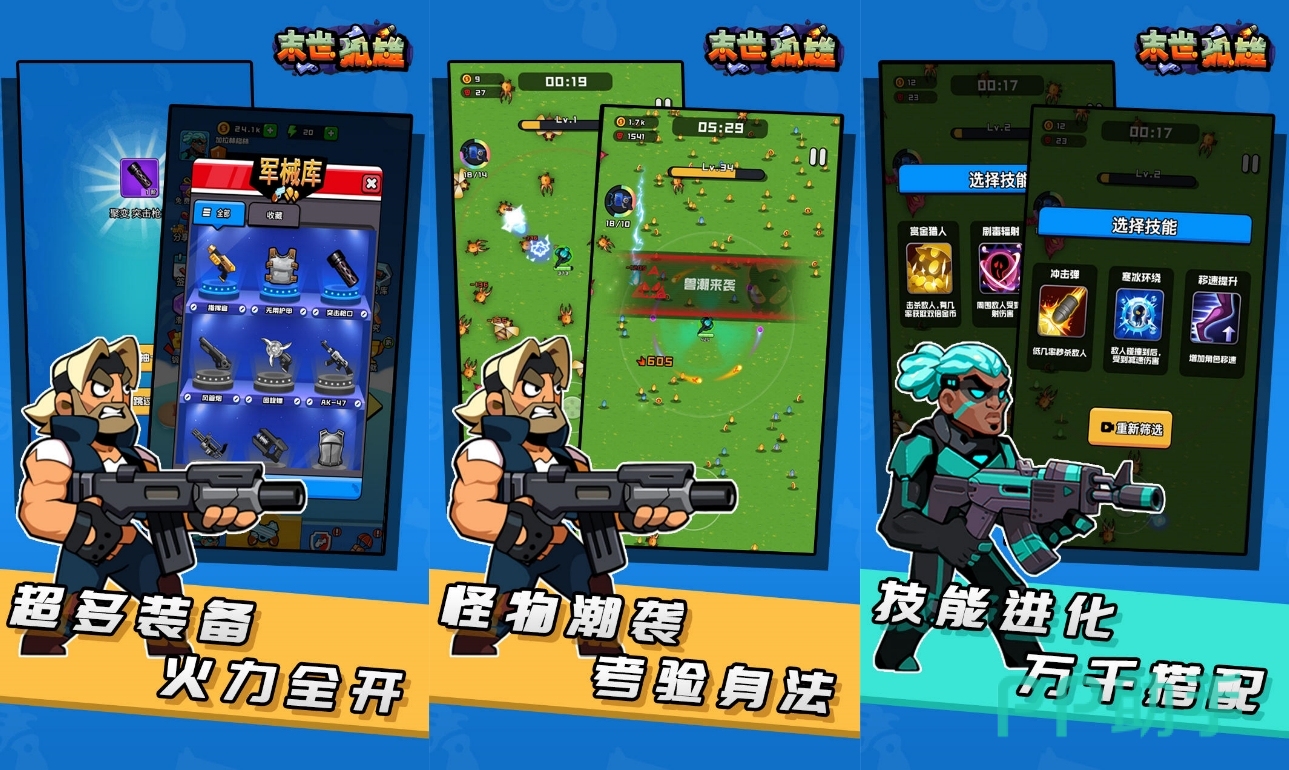 俯视视角融合了割草与闯关的末日射击大作,可以前往各种背景地图下与四面八方涌来的怪物对抗,你将获得大量先进且充满科技风的武器枪械,能够在关卡过程中接连选择技能强化自己,或是让子弹变多或是让子弹附加特殊效果,每一个都为你的角色带来切实增强,并为后续对抗关卡boss增加更多战术选择,同时它末日的世界观和枪战的操作玩法也非常硬核,让你始终处在一个激烈的战斗氛围畅爽杀敌。