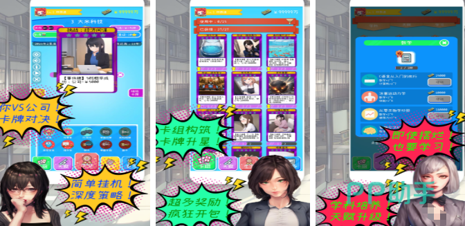 摸鱼大作战游戏中,采用卡通二次元画风,将办公室、会议室等职场元素融入场景设计,搭配诙谐的剧情对白,营造出轻松解压的氛围,玩家在游戏中扮演职场打工人,目标是让就职的公司亏空倒闭,同时工资奖金照拿还能薅羊毛,前往下一家公司并获得涨薪,在玩法上玩家可从数百张卡牌中自由搭配,形成专属摸鱼策略。
