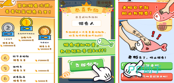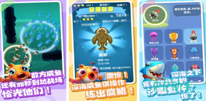 在全民摸鱼游戏中,将放置、合成以及竞技玩法融合,玩家通过滑动屏幕操控鱼群,在与全球对手同场竞技的比赛里,寻觅并吞食中立小鱼来壮大自己的鱼群,十人同屏竞技模式操作简便,玩家能在一分钟内体验吃鸡的爽快,通过吸引最多的鱼来获胜,游戏里边还设有生存模式与派对模式,需要玩家达到白银等级3解锁。