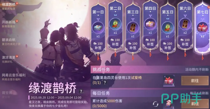 首先是“缘渡鹊桥”限时活动,大家在8月28日到9月4日期间,每天都上线签到,并完成使用蓬莱岛试爱椅、累积造成5000伤害等任务,就能获得极品挂饰、织锦福袋、限时加成等等不同的奖励。
