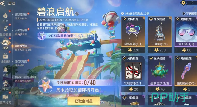 8月28日到9月11日限时开启碧浪起航,在这个期间游玩任意生存模式,并开启落物堆能帮助自己获取到金潮星,开启金色落物堆或者是绿色的落物堆,能获取到跳跳海星礼,使用金潮星能兑换到极品挂饰“闪亮星箍”、殷紫萍专属底座“万重山”等限时奖励,而打开跳跳海星礼可以获取到随机奖励。