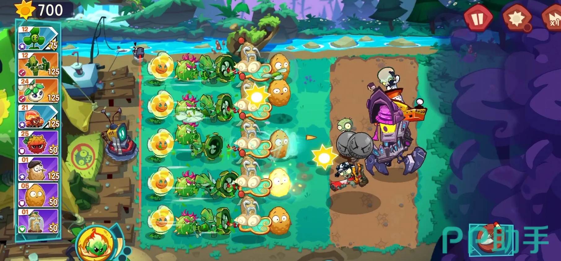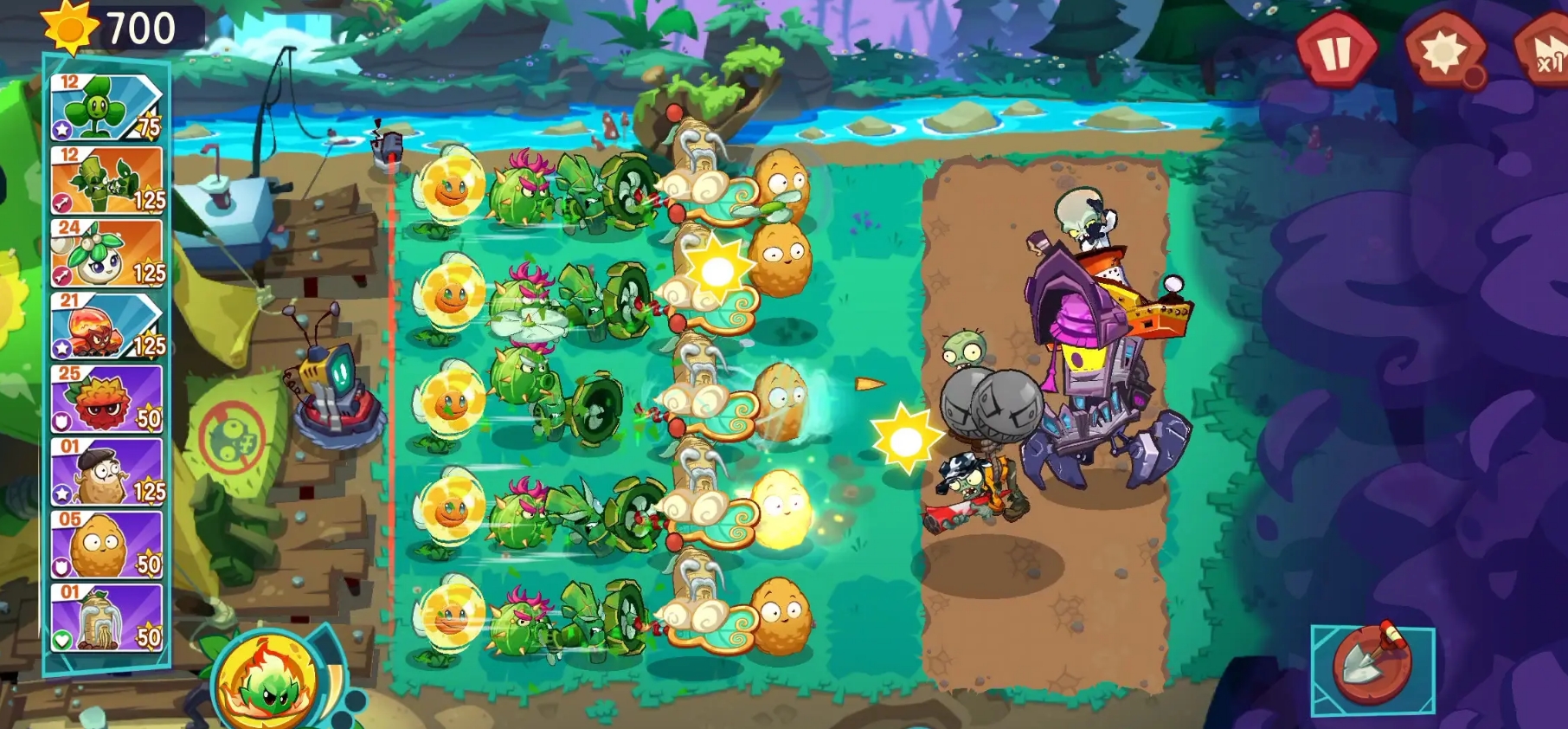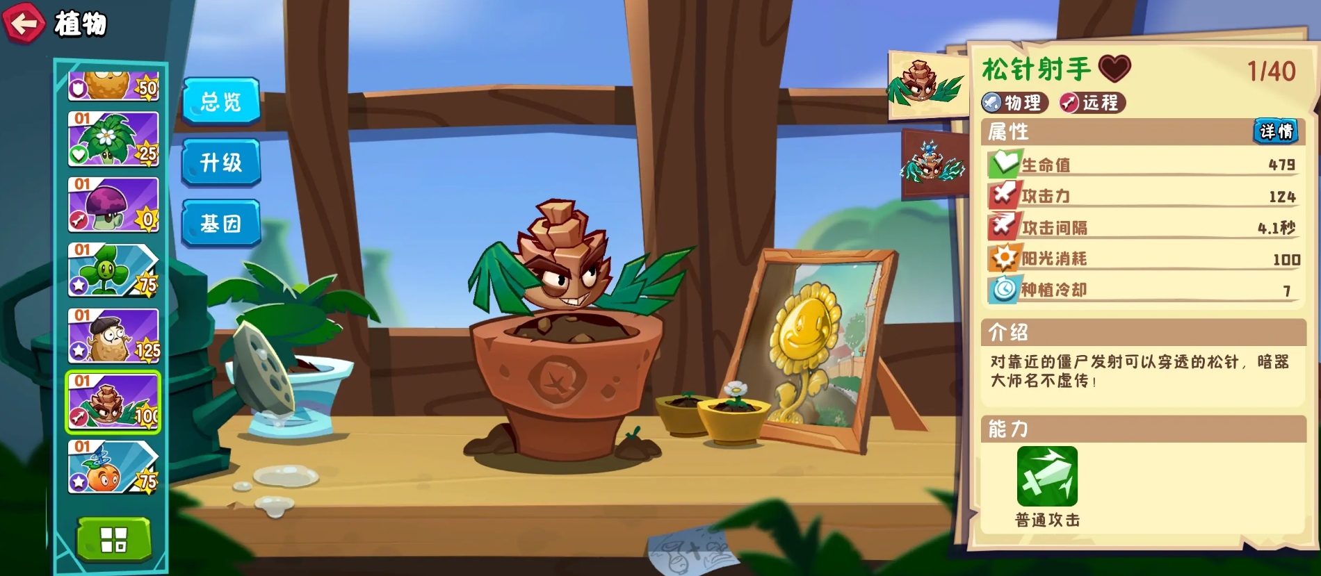 植物方面,此作在画风变得更为Q版的情况下,植物们在外观上也有了不小的变化,但也保留了它们在前代作品中的形象要素,攻击特效也拥有更为直观的视觉效果。部分植物还能通过融合来产生额外的效果,例如在给太阳花加上三叶草后,它不仅保留了原本能生产阳光的能力,同时也具备着三叶草的吹风能力,可让它对敌人造成伤害。一些特殊的融合效果更是会改变植物的攻击方式,就像仙人掌与三叶草的组合能让仙人掌飞到空中,并能更快速地去攻击气球敌人。各位可在游玩时善用融合机制,策略过关。