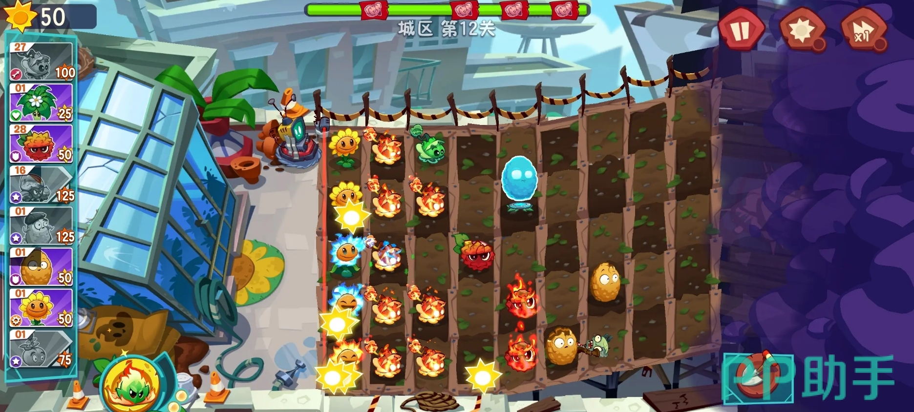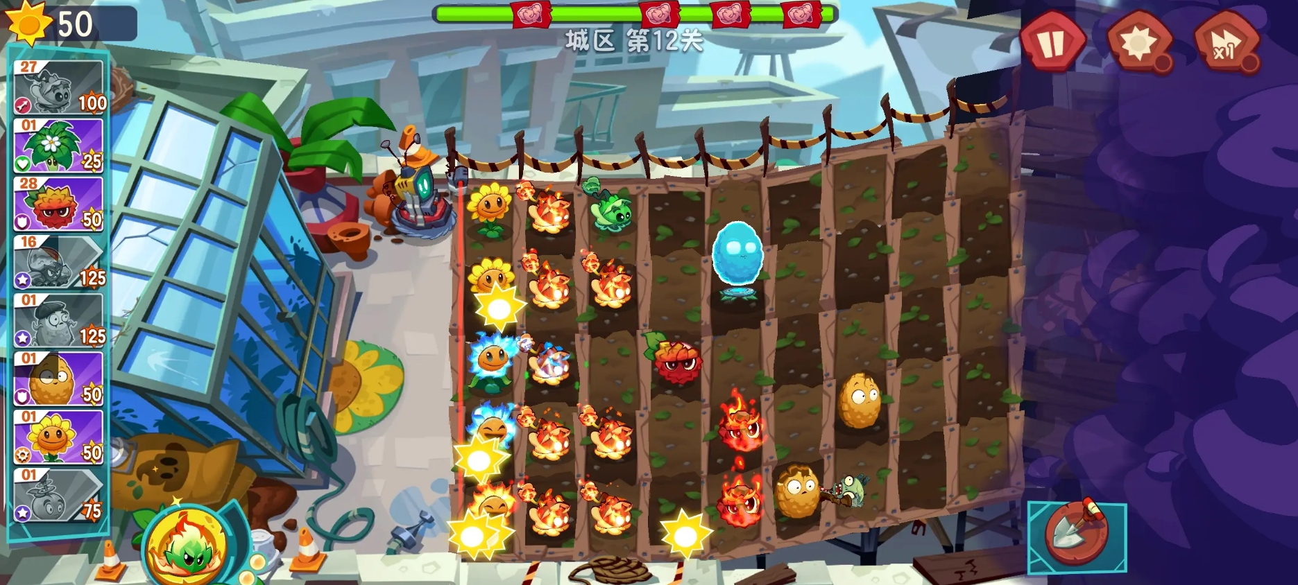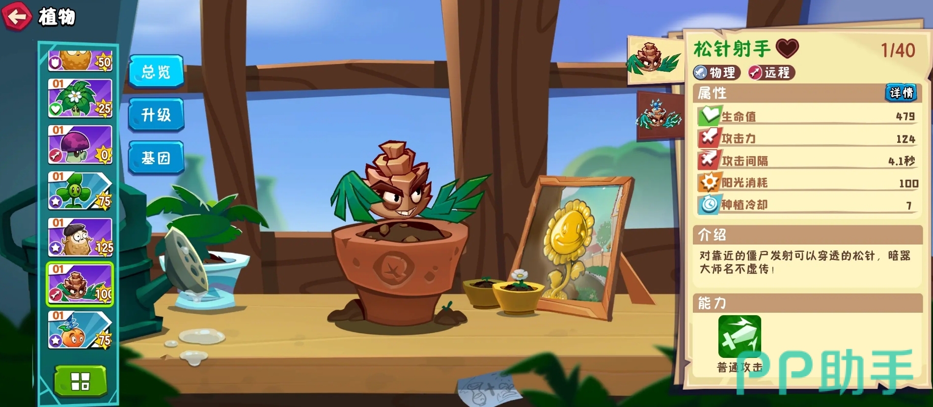 植物方面,此作在画风变得更为Q版的情况下,植物们在外观上也有了不小的变化,但也保留了它们在前代作品中的形象要素,攻击特效也拥有更为直观的视觉效果。部分植物还能通过融合来产生额外的效果,例如在给太阳花加上三叶草后,它不仅保留了原本能生产阳光的能力,同时也具备着三叶草的吹风能力,可让它对敌人造成伤害。一些特殊的融合效果更是会改变植物的攻击方式,就像仙人掌与三叶草的组合能让仙人掌飞到空中,并能更快速地去攻击气球敌人。各位可在游玩时善用融合机制,策略过关。